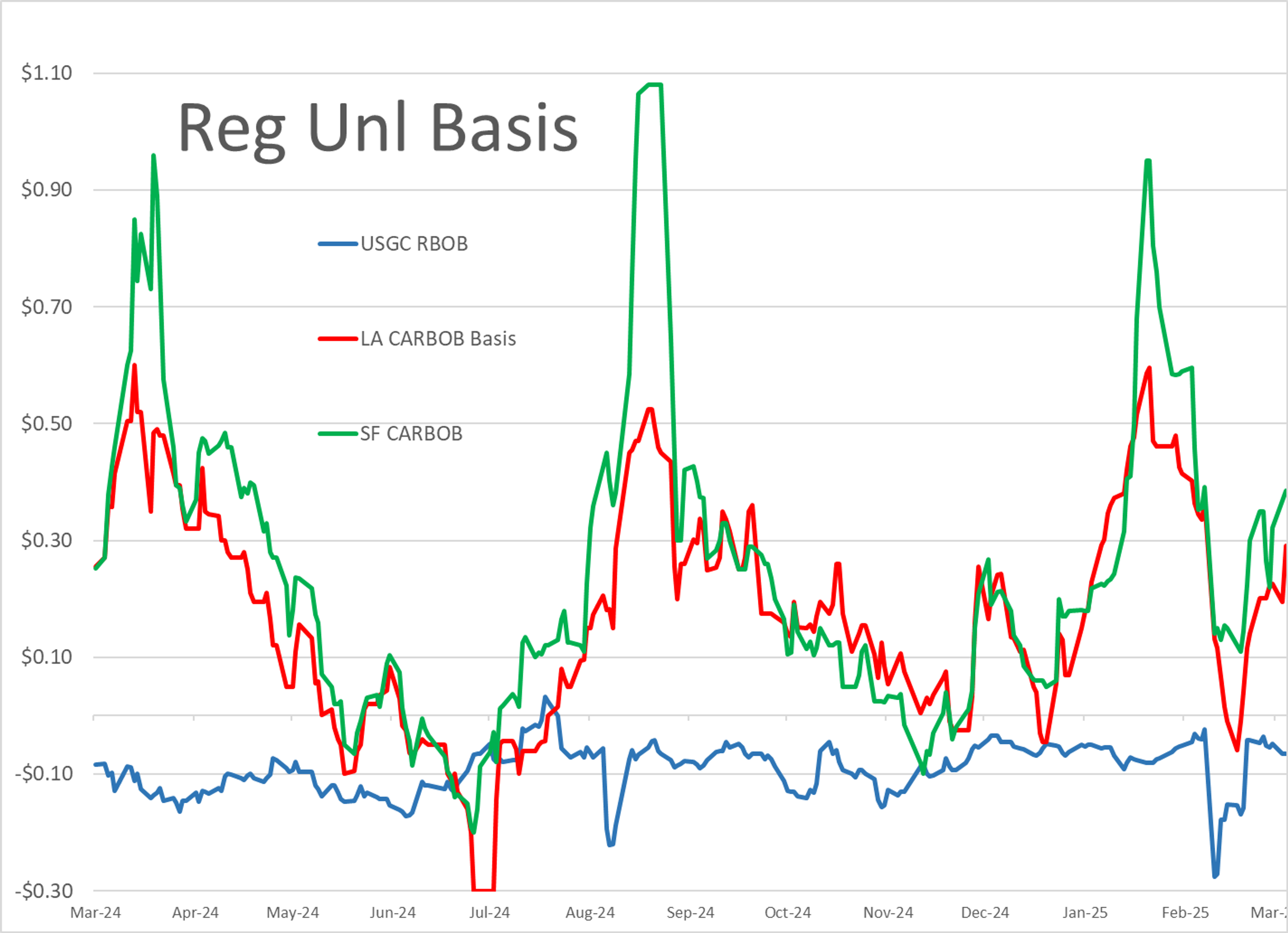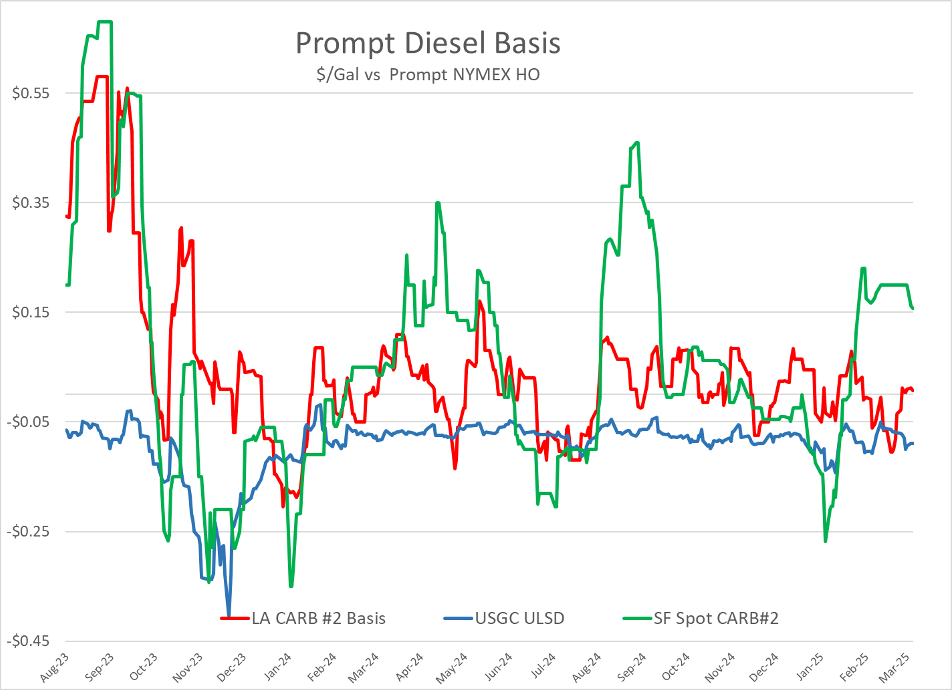 Gasoline basis values on the West Coast are rallying again this week after P66 had an upset at its LA-area refinery over the weekend, and the repairs being made by PBF at its Torrance refinery were extended from 1 week to 2. Originally the plant filed flaring plans with AQMD regulators that would last from 3/18-3/25, but that work has now been extended to 4/2. LA Spot CARBOB values jumped 10 cents on the day, while San Francisco CARBOB rallied in sympathy as the loss of Torrance barrels directly impacts PBF’s ability to replace the loss of its Martinez refinery output which is expected to last most of the year.